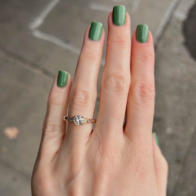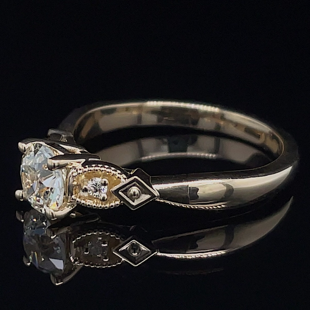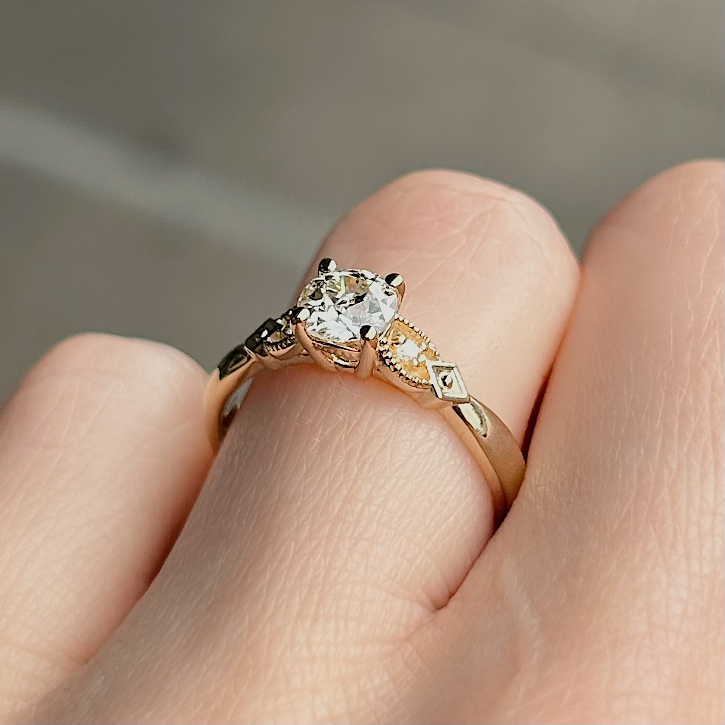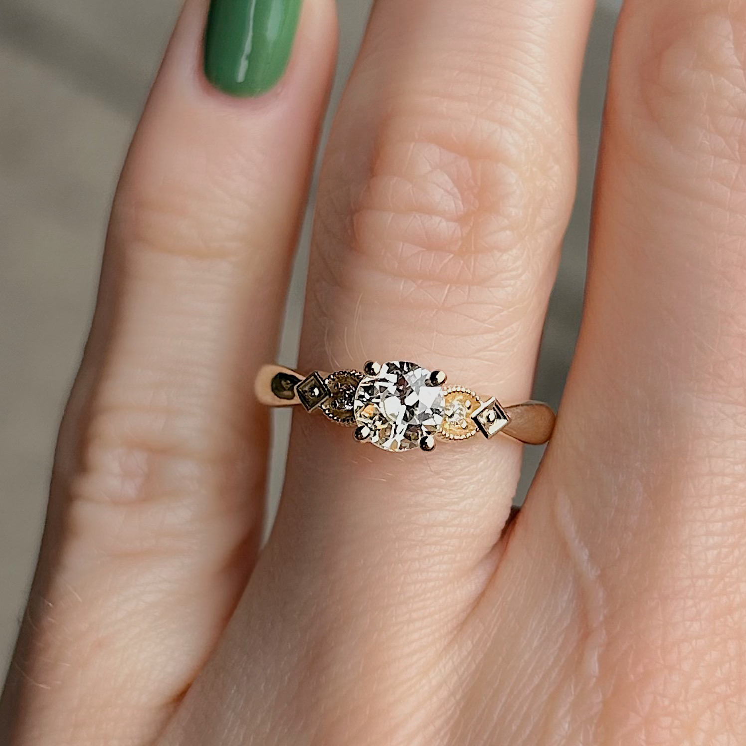 Crafted of 14k yellow gold, this one-of-a-kind ring features a recycled natural old European cut diamond, with natural round brilliant diamonds on each side. Talk about timeless and unique! We do our best to capture the vibrancy of the stones and metal, though this ring is even more beautiful in person. Crafted of 100% recycled stones and metal.