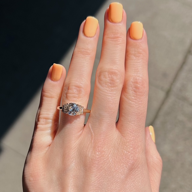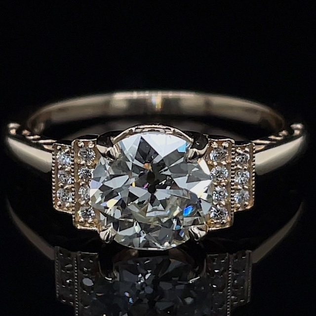 Crafted of 14k yellow gold, this Art Deco inspired ring features a natural old European cut diamond, with natural round brilliant accent diamonds. We do our best to capture the vibrancy of the stones and metal, though this ring is even more beautiful in person. Crafted of 100% recycled metal and stones.