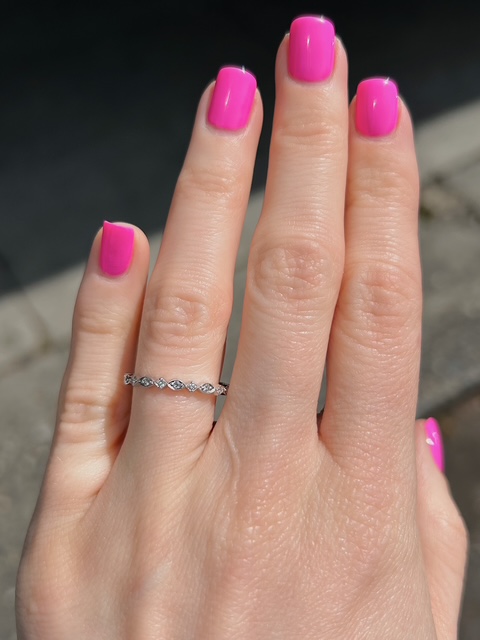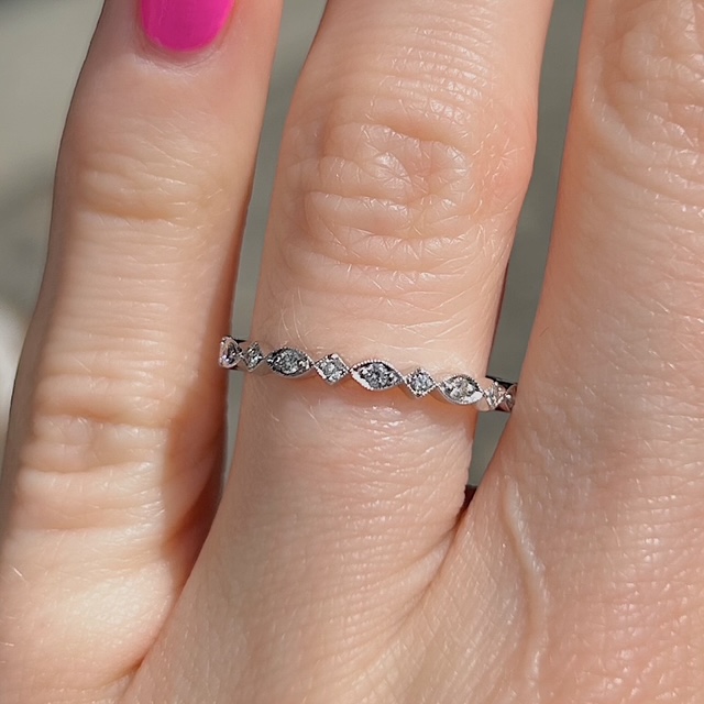 Crafted of 14k white gold, this vintage inspired band features natural diamonds in an engraved, milgrain accented setting. Perfect as a wedding band or stacking ring! We do our best to capture the vibrancy of the stones and metal, though this piece looks even better in person! Crafted of 100% recycled metal and stones.